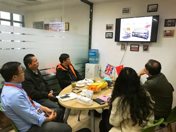 ▲江苏劳保协会来访领导观看博迪嘉品牌宣传视频